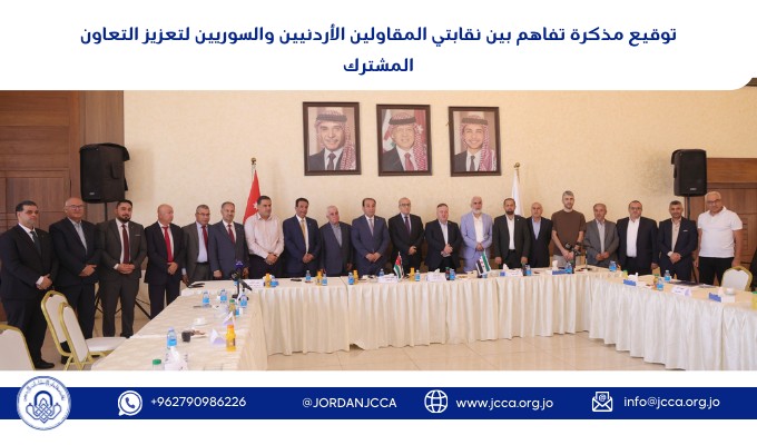 برعاية معالي وزير الأشغال العامة والإسكان المهندس ماهر ابوالسمن، وقّعت نقابتا المقاولين الأردنيين والسوريين مذكرة تفاهم تهدف إلى تعزيز التعاون في مجالات التدريب وتبادل الخبرات وتنظيم المؤتمرات والندوات المشتركة، إضافة إلى دراسة توحيد أنظمة التصنيف بما يخدم مصلحة مقاولي البلدين.