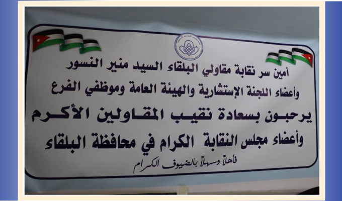 ضمن سياسة الانفتاح وتعزيز التواصل المباشر مع المقاولين في مختلف محافظات المملكة، واصل مجلس نقابة المقاولين الأردنيين لقاءاته الميدانية، حيث كانت محطته الجديدة فرع النقابة في محافظة البلقاء، برئاسة نقيب المقاولين السيد فؤاد الدويري، وبمشاركة نائب النقيب الدكتور معروف الغنانيم وأمين الصندوق المهندس رفيق مراد وعضو المجلس المهندس غسان المرايات، وعدد من مدراء النقابة.